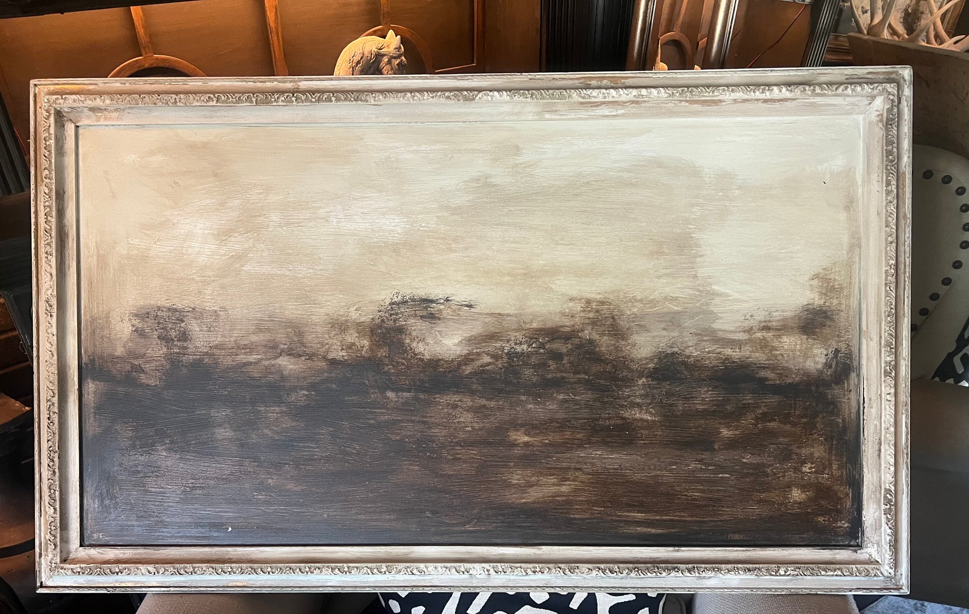 A moody, ethereal landscape that captures the quiet meeting of earth and sky. Layers of espresso, taupe, and cream blend seamlessly across the canvas, creating depth and movement reminiscent of distant hills at dusk. The soft brushwork and muted palette evoke calm and timeless elegance, while the ornate, antiqued wood frame adds a refined vintage touch. Perfect as a statement piece above a console, bed, or mantle.