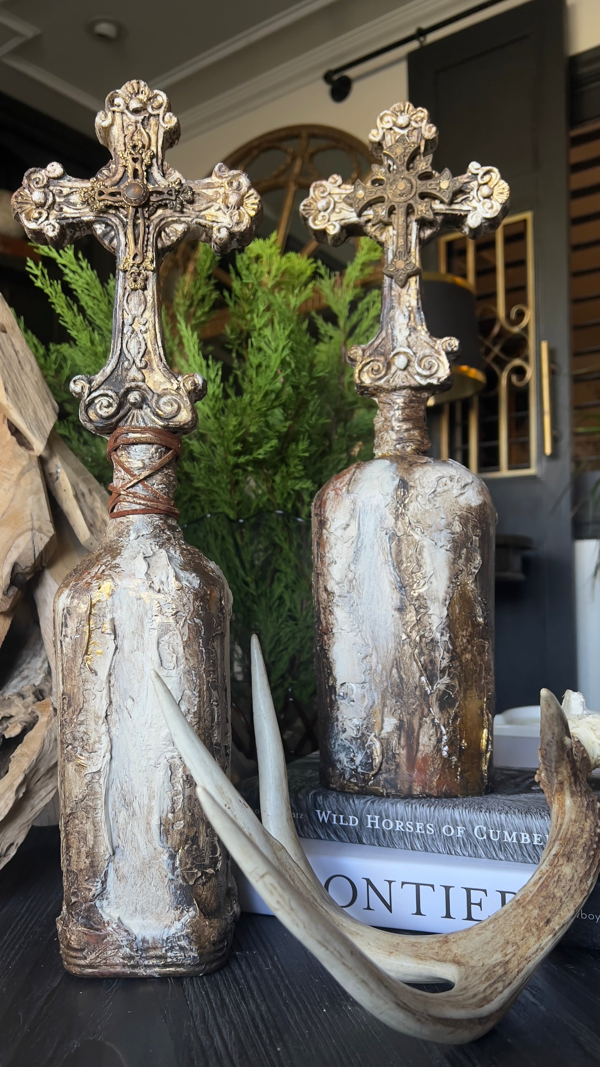 The Anointed Cross Reliquary Bottles are sculptural, faith-inspired statement pieces that blend rustic texture with sacred symbolism. Each bottle is crowned with an ornate cross, finished in layered neutral tones of ivory, taupe, and antique gold. Rich surface texture and timeworn patina give each piece an old-world, devotional presence—meant to feel discovered rather than made.