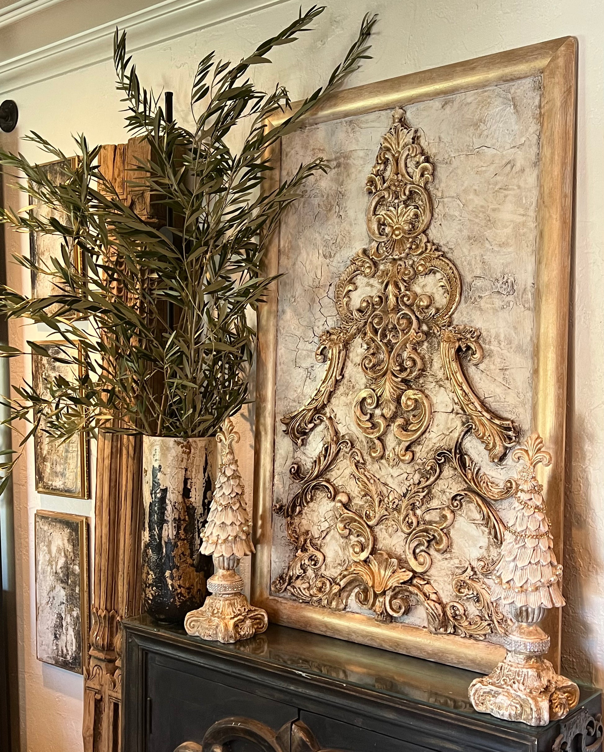 A one-of-a-kind large oversized sculpted Christmas tree panel, adorned with ornate acanthus scrolls, hand-gilded detailing, and rich antique texture. This heirloom-style artwork brings an elevated, vintage holiday charm to your home and makes a breathtaking focal point for the season.