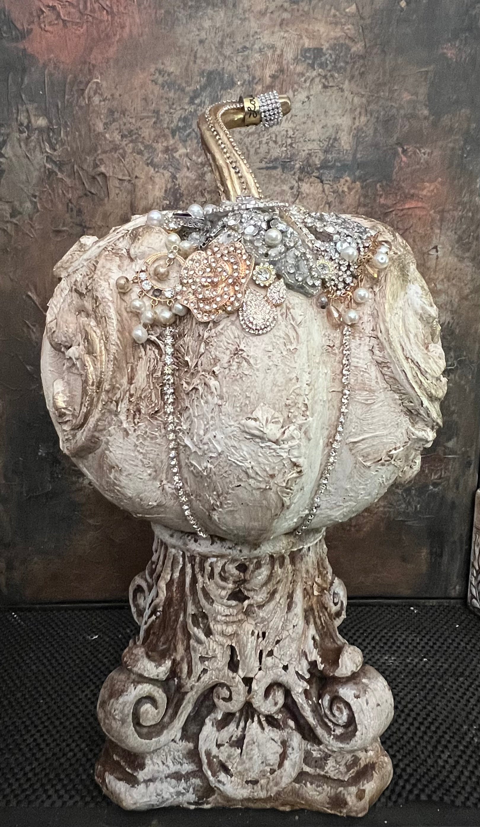 Old-world romance meets autumn allure in this richly textured, jewel-encrusted pumpkin. A hand-gilded stem curves gracefully above a sculptural body finished in layered plaster and timeworn patina. Vintage brooches, rhinestones, and pearls cascade across the crown like heirloom finery, catching the light with every facet. Displayed on your choice of three baroque bases, this one-of-a-kind piece brings a luxe, collected presence to mantels, entry consoles, or dining tables all season long.