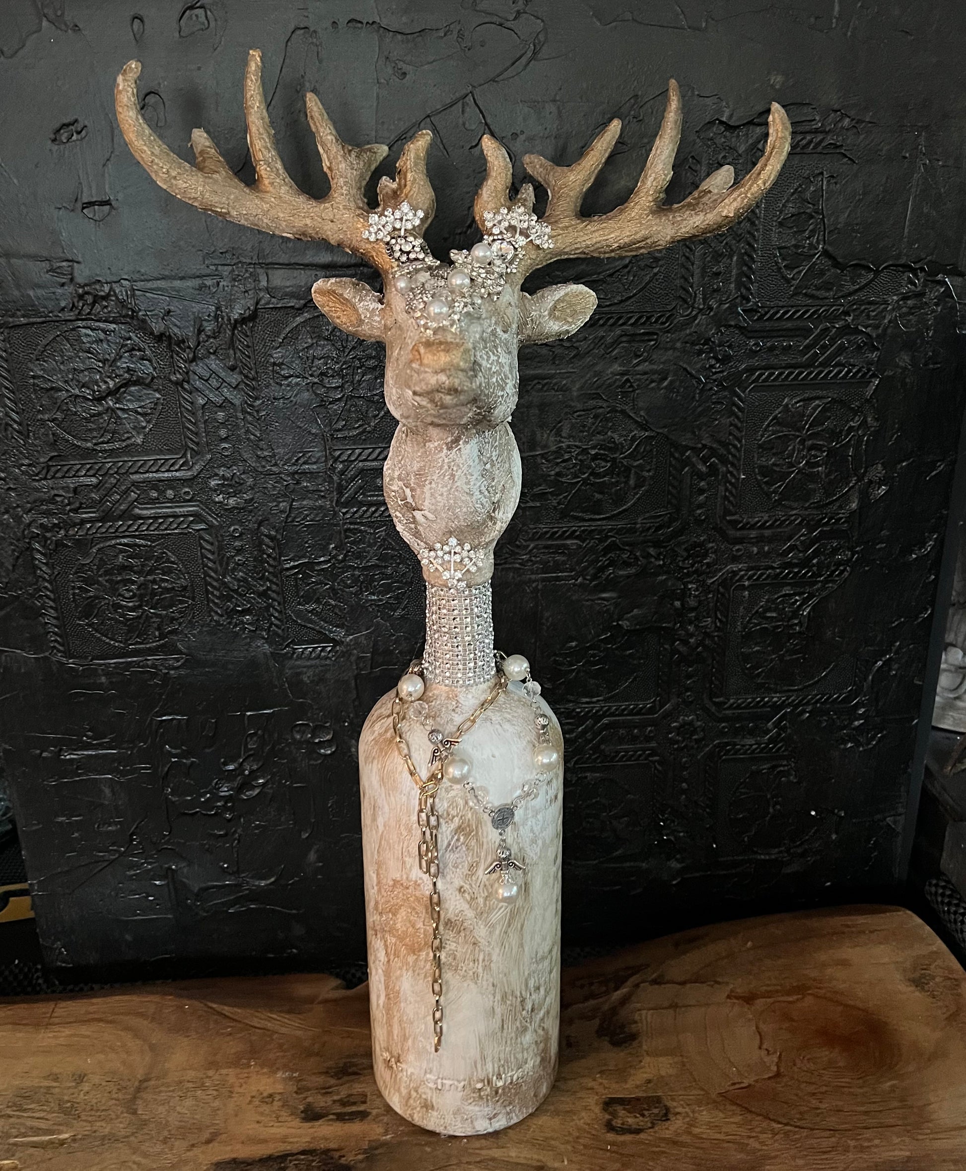 A stunning, statement-making reindeer crowned in hand-set jewels and draped in pearl accents, this one-of-a-kind sculptural bottle brings an elegant winter charm to any space. The distressed, marbled bottle paired with the textured antlers creates a beautiful contrast of rustic and refined—while the vintage-inspired rhinestones and pearls add just the right touch of holiday sparkle. This piece feels like a treasured heirloom pulled from an old Southern manor’s Christmas collection.
