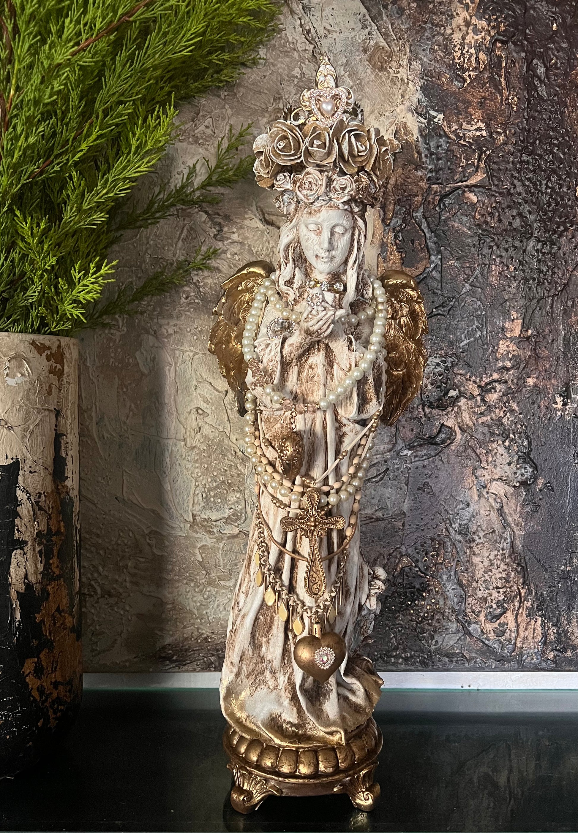 Her softly weathered ivory finish is warmed with antique gold accents, from her wings to the ornate base beneath her feet. A cascading rosary and heart reliquary rest at her center, drawing the eye downward in a gentle, devotional rhythm. The overall effect is both powerful and tender — an angel meant not just to be seen, but felt.