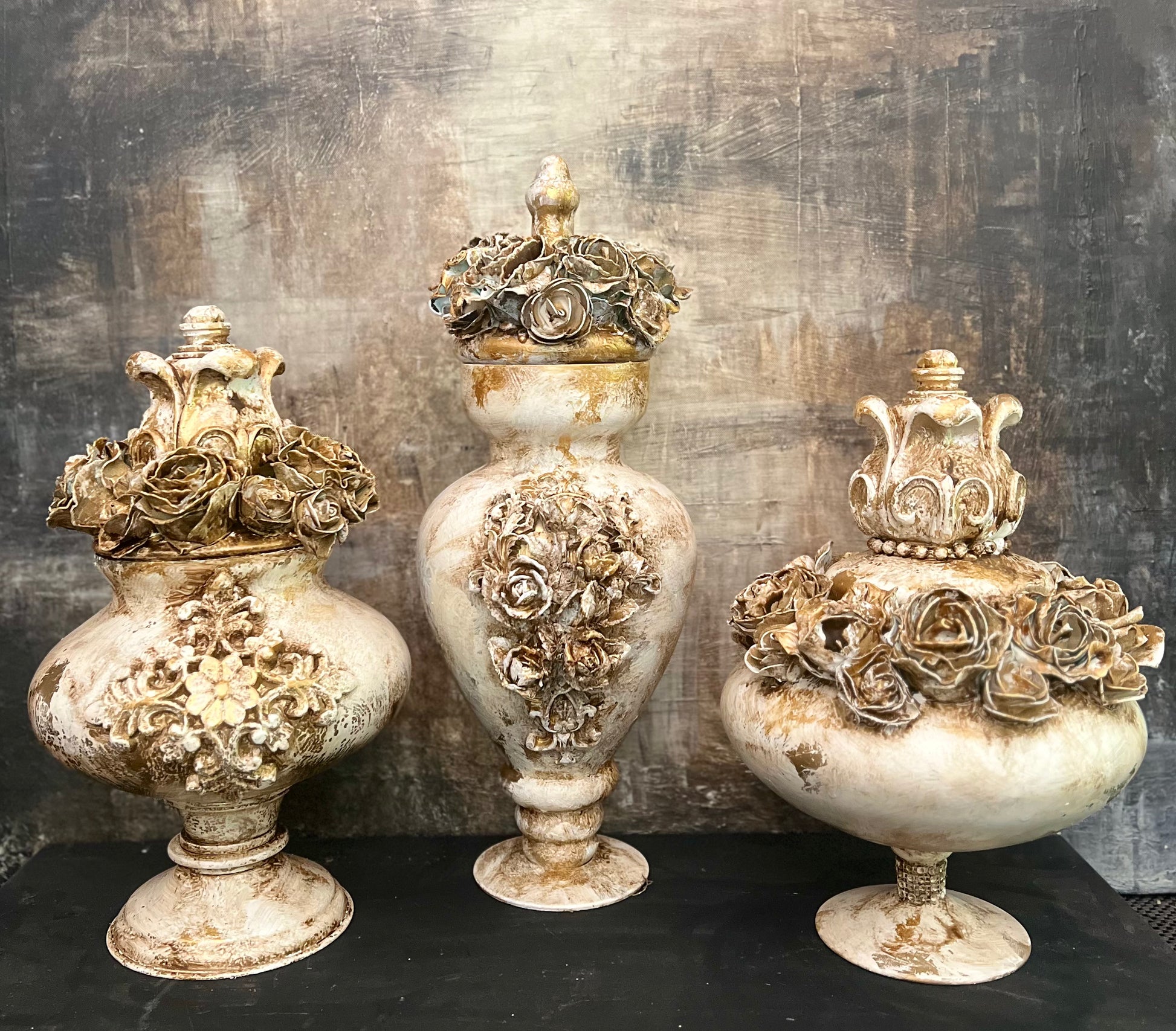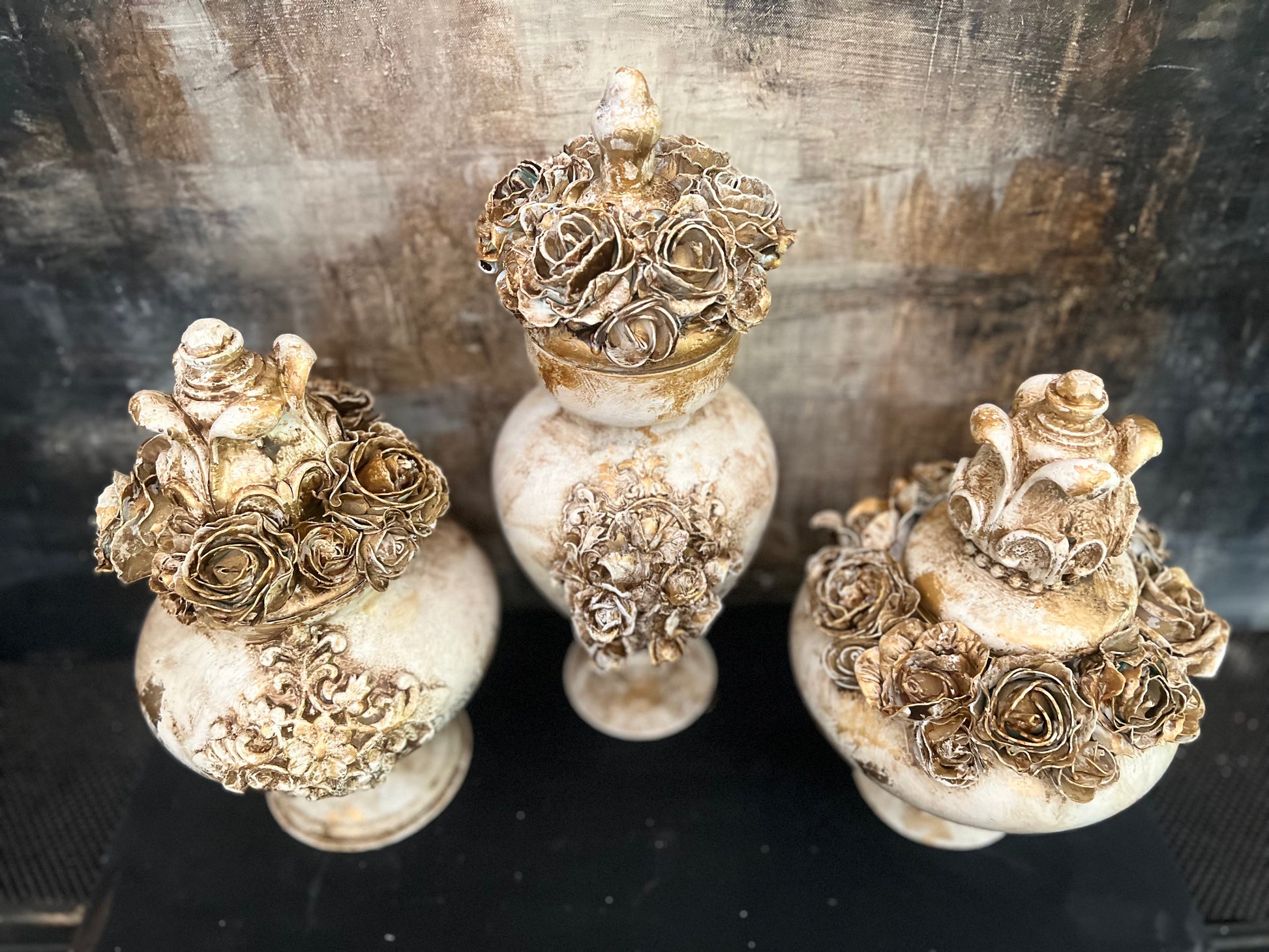 A breathtaking collection of one-of-a-kind lidded vessels, each adorned with sculpted roses and intricate detailing that captures the elegance of timeless European design. Their versatile function allows them to be displayed together for a statement centerpiece or individually to add charm to multiple spaces. The removable lids make them as functional as they are decorative, ideal for holding keepsakes or simply standing as art pieces.