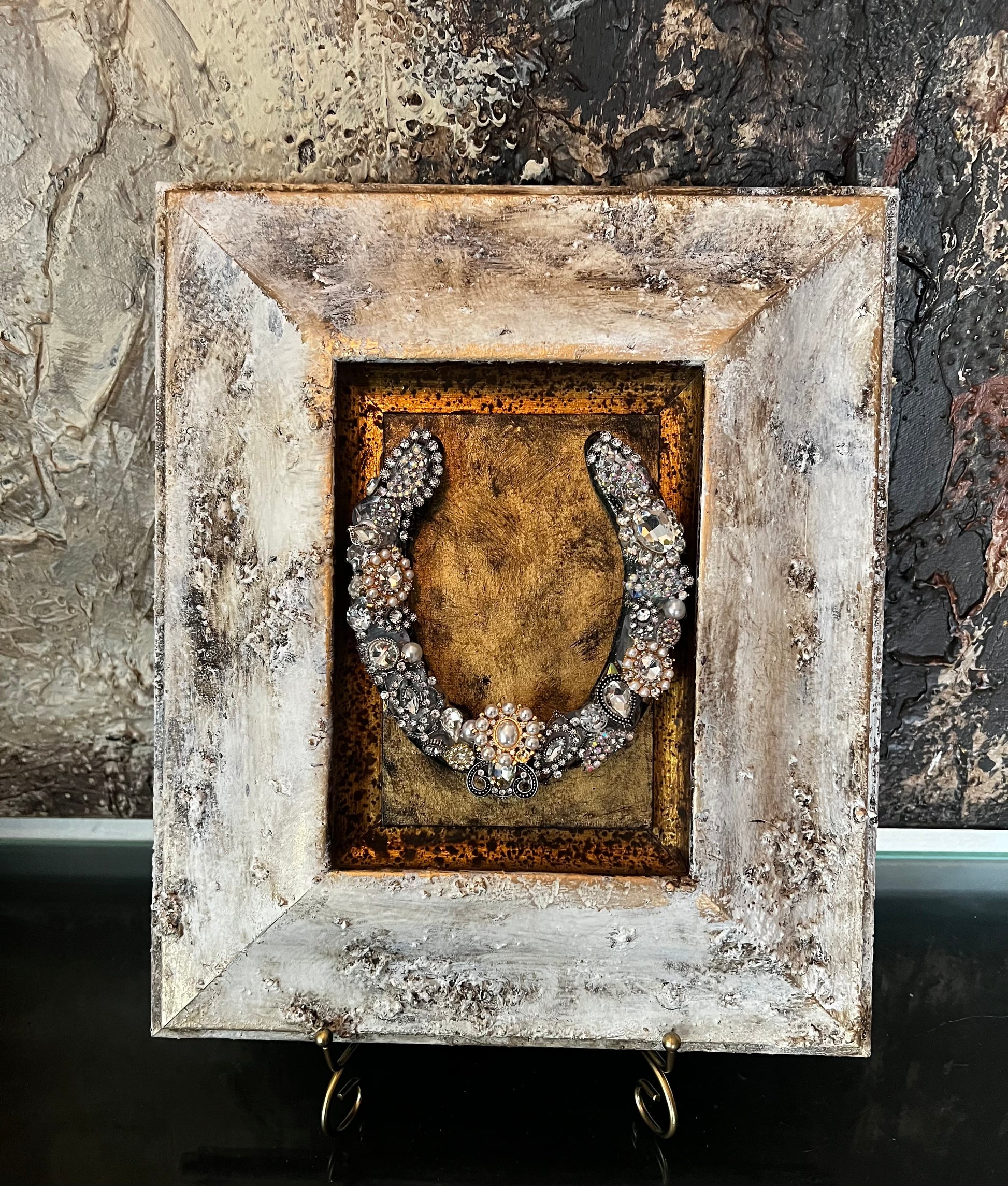 A western devotional rendered in quiet strength, Sanctuary of Steadfast Grace features a hand-embellished horseshoe set within a deeply distressed shadowbox frame. Adorned with crystals, pearls, and antique-inspired findings, the horseshoe symbolizes protection, perseverance, and faith carried through life’s hardest roads. The aged ivory and burnished gold tones give this piece the feeling of something discovered rather than made — a sacred object meant to stand watch.