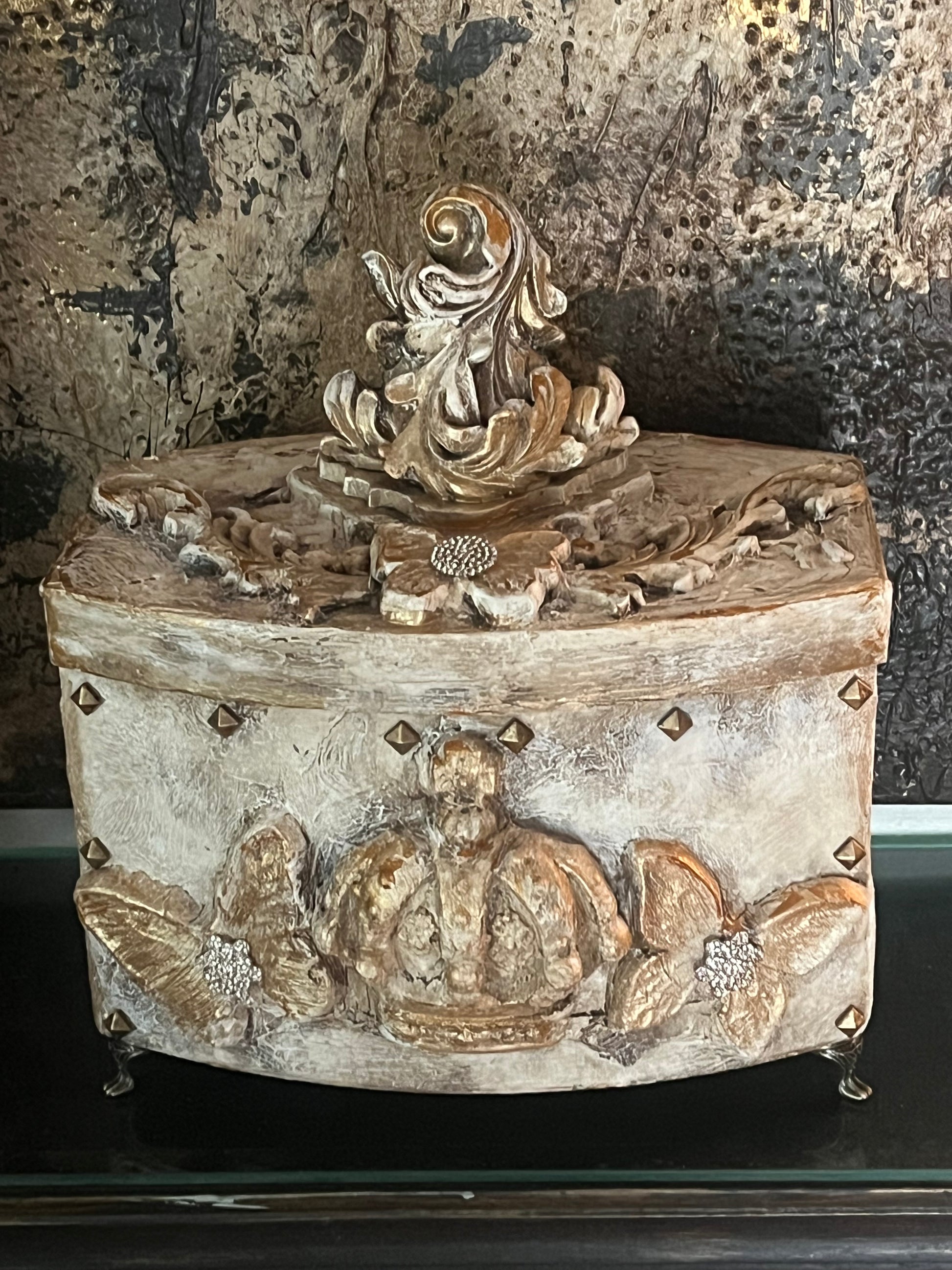 This one-of-a-kind handmade paper mâché reliquary exudes strength, elegance, and timeless grandeur. Sculpted with a regal crown centerpiece framed by gilded butterflies and floral motifs, it carries the essence of heritage and divine symbolism. Elevated by its ornate lid crest and resting on decorative feet, this vessel blends artistry with durability, making it a true statement heirloom.