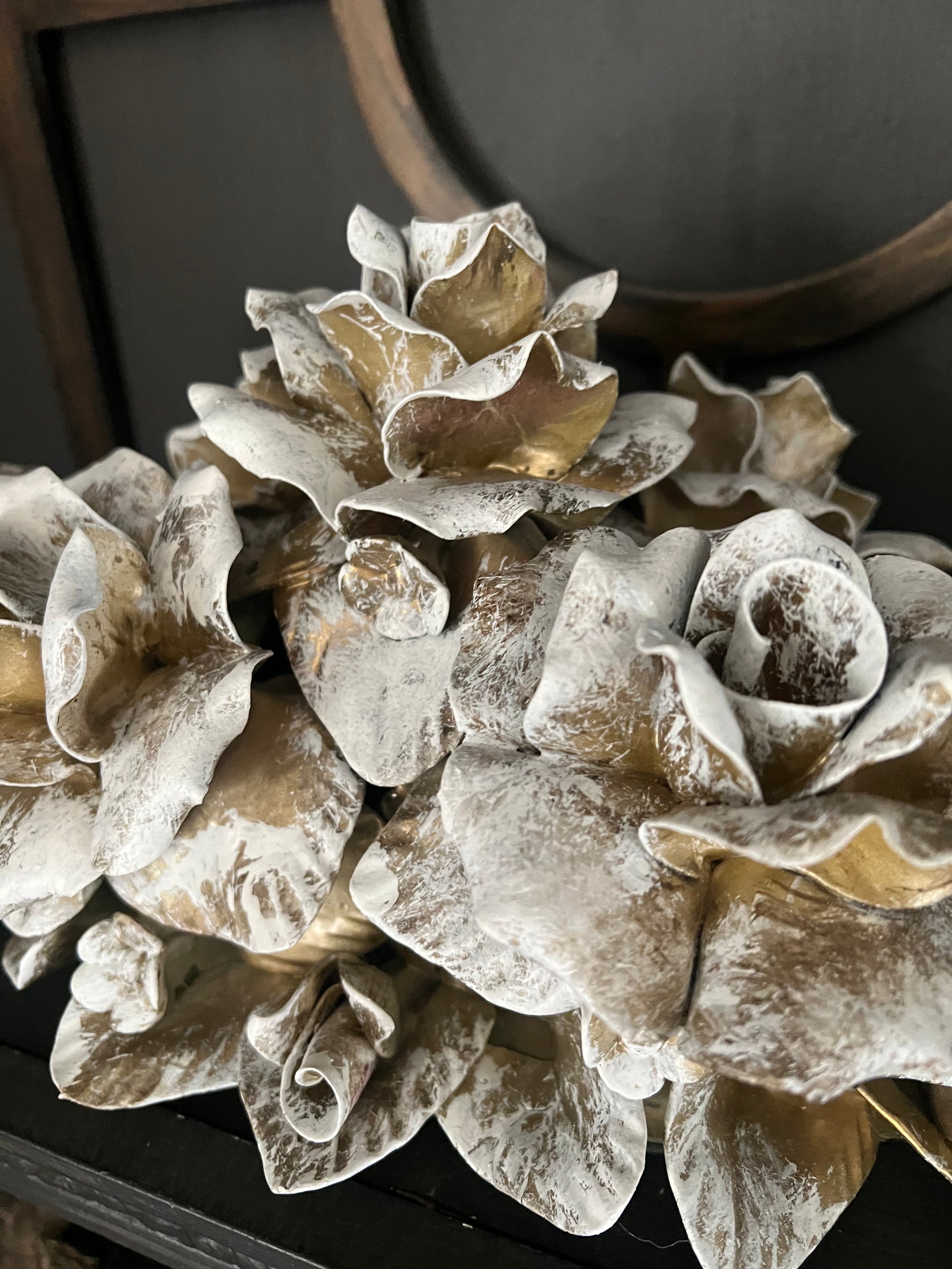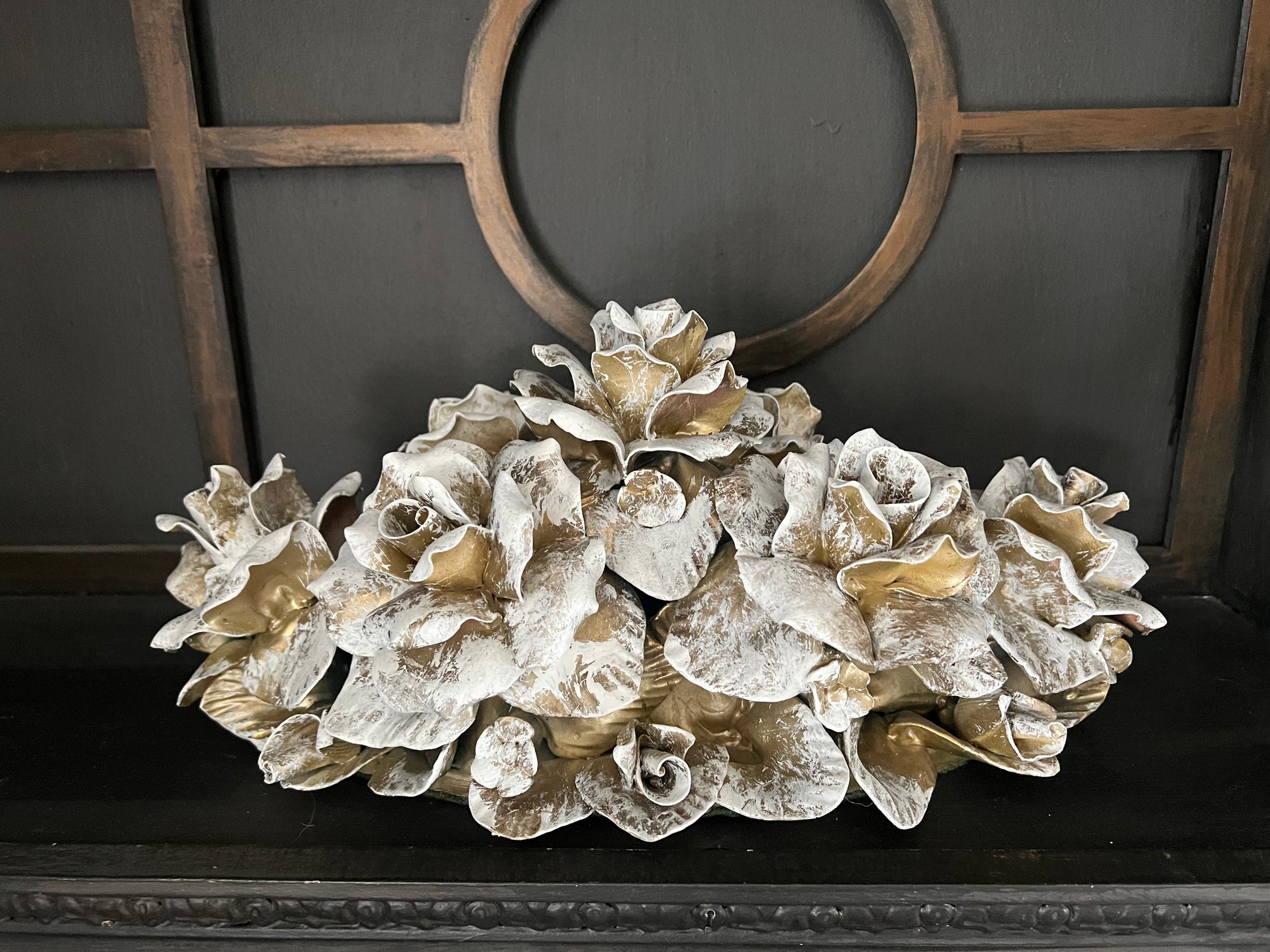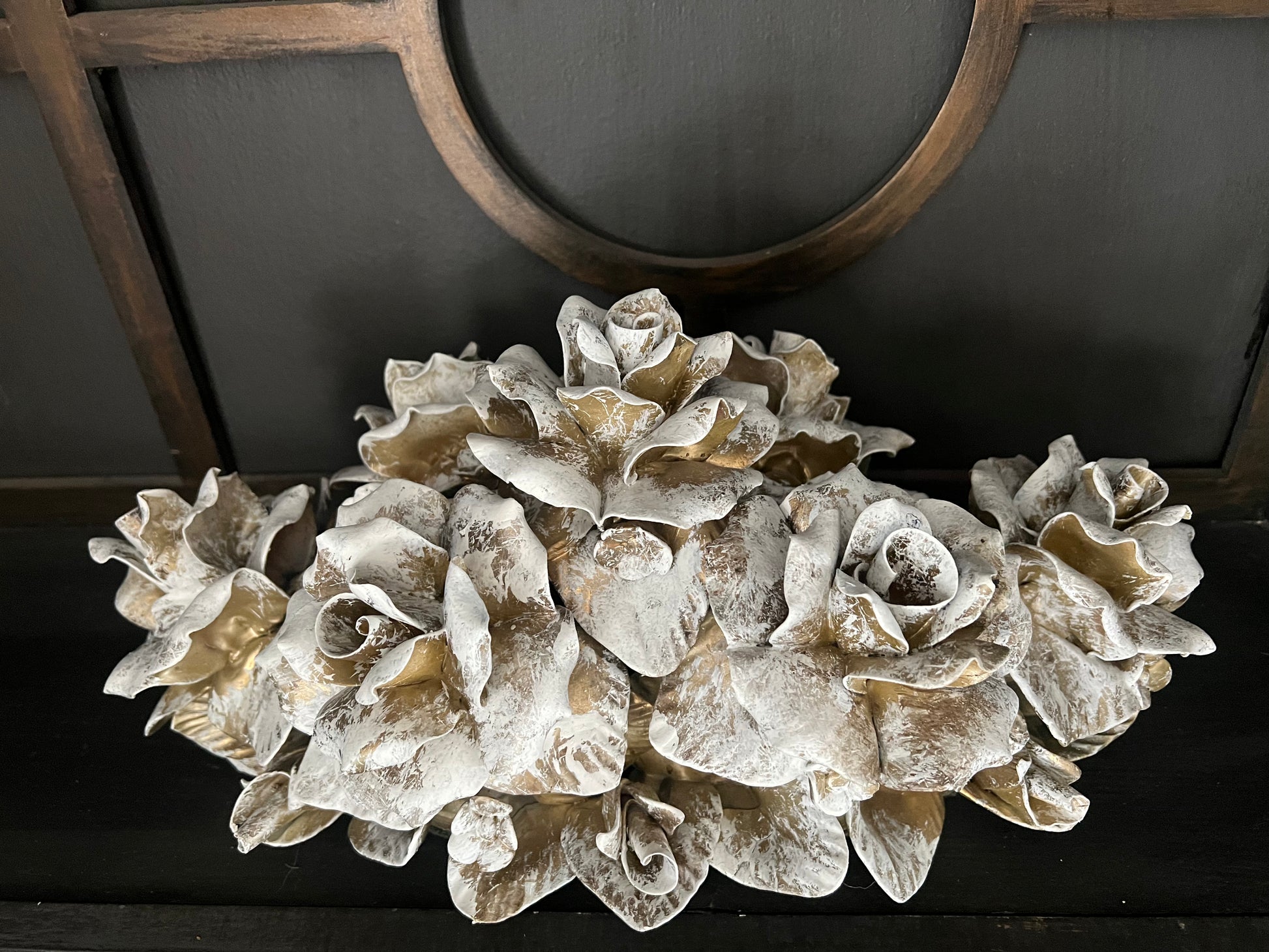 A stunning one-of-a-kind vintage ceramic rose cluster, fully reimagined in soft golds and creamy whites. Each petal is hand-finished for a timeless, heirloom look, blending vintage romance with Southern elegance. A perfect accent for mantels, entry tables, or display shelves, bringing a refined, graceful touch to any space.